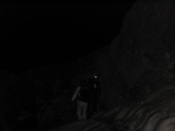 Around the next corner their was a steep rocky descent (~15') with a simple snowfield to cross at the bottom. Our first class 4 moves of the day were required to make it down. There was enough skylight to see our surroundings adequately.