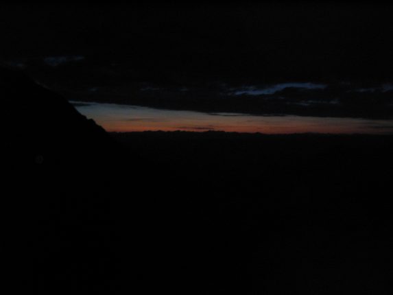 By 4:45am we had all reached the saddle and saw the faded blue/red/orange pre-dawn colors on the eastern horizon. We took a snack, and decided to continue in the dark as long as the trail was navigatable without daylight.