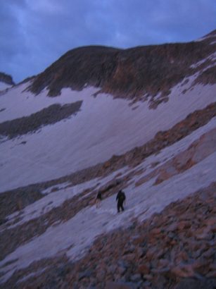 Looking down the back side of the ridge, we saw loads of snow fields over a boulder field. But they weren't too steep thankfully. The snow was still a bit hard without the sun to soften it, so it was tough to dig in a good foothold. I used a plastic shovel in one hand, and a pocket knife in the other, and did a 4-point scramble across the snow. This crawl felt more efficient and speedy than using a lone ice axe.