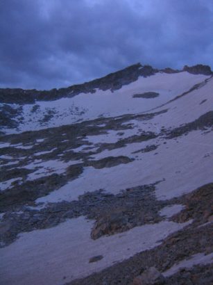 We had a quick breakfast, packed our bags with the essentials for the climb, and hung the food up again before leaving camp with our headlamps leading the way. It was 4am when we descended the knoll and arrived at the trail to start the climb. A glance toward the northeast sky showed a slight "less darkness" indicating the sun under the horizon. Above, the skies were now blotted with huge black globs of cloud, yielding an occasion open star.