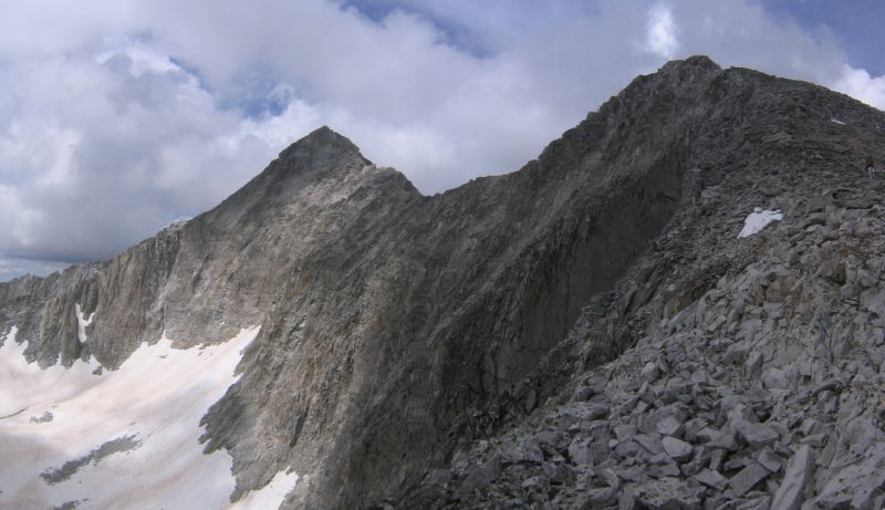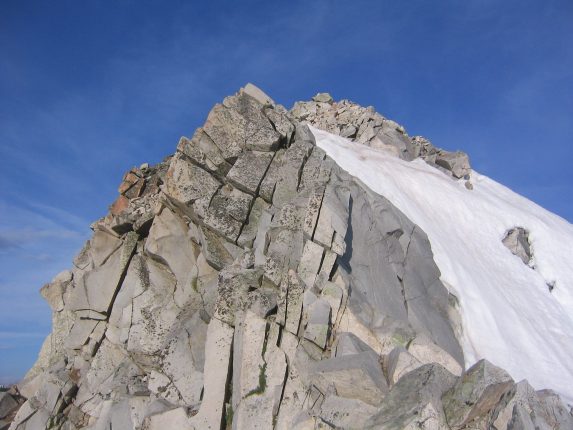 There was lots of boulder hopping that took us to a snowfield that rose to the top of a ridge. We followed the boulders alongside the snow, and when we reached the lip of the ridge, we finally saw our end goal of Capital, along with its massively sharp ridge! The boulder field continued to rise on our right up to that crazy looking ridge at a point called K2 (13664'), which is a popular "bail-out" point.