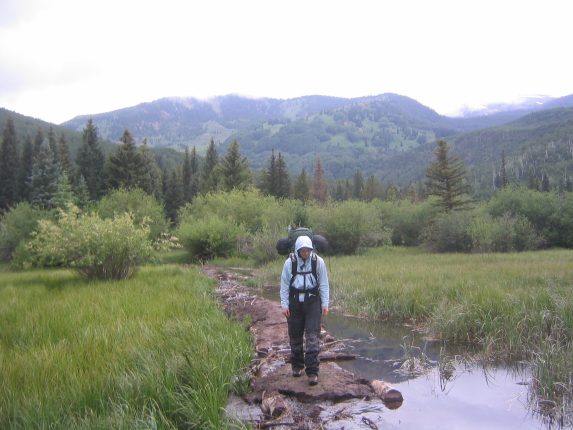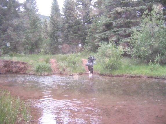 There was debate about whether to stay here for the night and hike out tomorrow, or leave now. We decided to pack up and leave, hoping our small rest would be enough for our legs have the strength to bring us back the 7 miles to the car. We left around 4pm, shortly before it started drizzling, and in 3 miles, when we got to the split in the trail, we saw tons of cows along the path we had taken on our way here. So we decided to try the path that stayed in the valley this time. We knew it was a little shorter, but had a 400' climb at the end. So we hiked along this beautiful trail, through Aspen groves, and on soft red clayish dirt, until we hit a creek crossing, and we saw that the log bridge had been cracked in half.