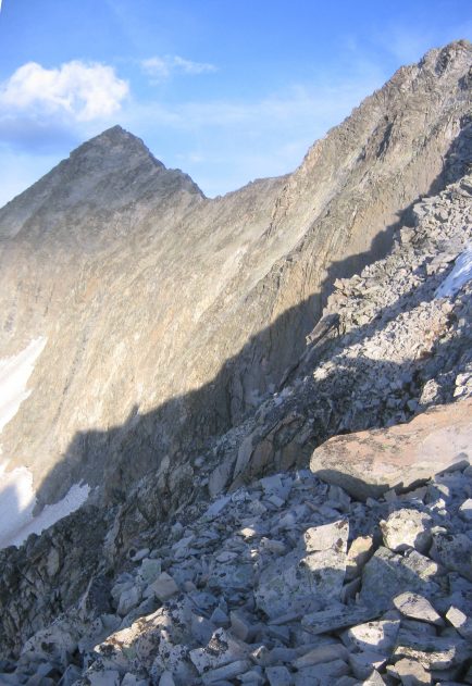 There was still plenty of ridge left and a good 500-600 feet to gain, so we continued on. The trail largely kept to the left of the ridge, though every so often the rock would get too steep on one side of the ridge, and it would cross up and over to the other side. It was also possible to hike up on top of the ridge, as it wasn't all completely sharp. It was around here where I realized that yes, I would summit this 14er. The weather was holding, and I felt that I could surely make it to the top and back before any storms.