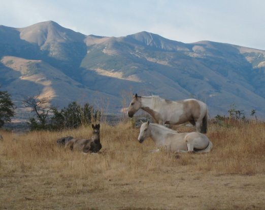 Some cow hides were hung on the fence, and we saw horses resting in the field...