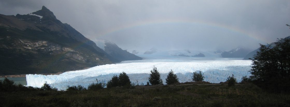 Our first views as we get off the bus and walk towards the boardwalk. A rainbow archs down to the right side of the glacier...