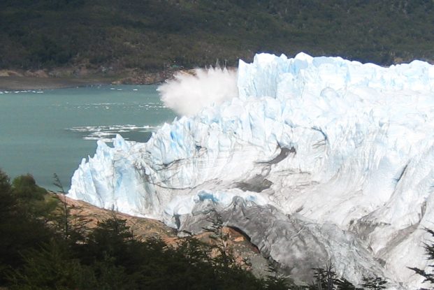 The glacier actually touches the land in it's center, and as it's still growing, creates an ice buildup against the land that collapses every three years or so...