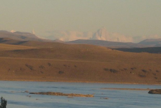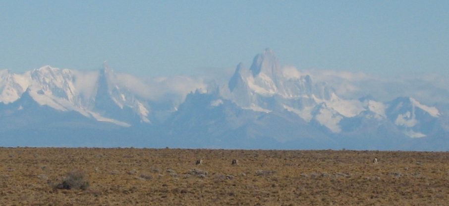 A distant look at Cerro Torre on the left, and Fitzroy in the middle, through the bus window...