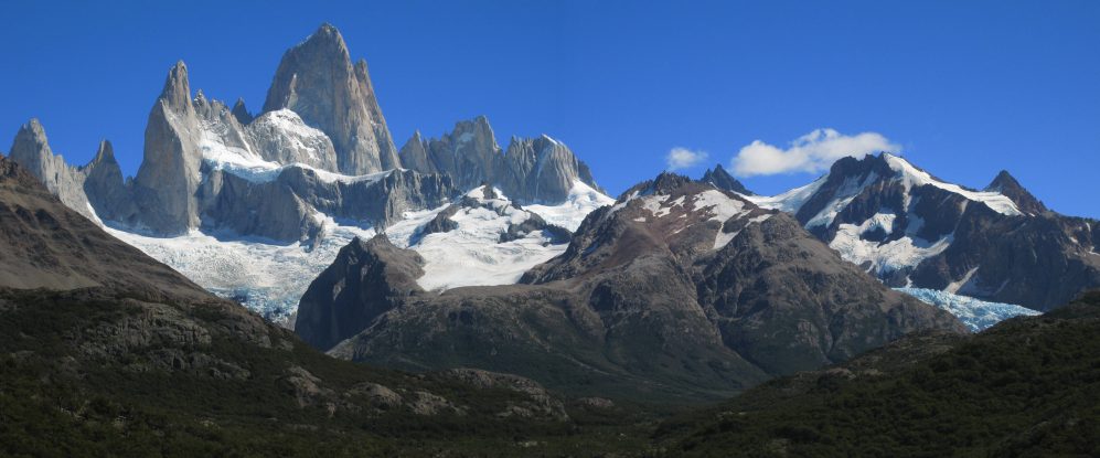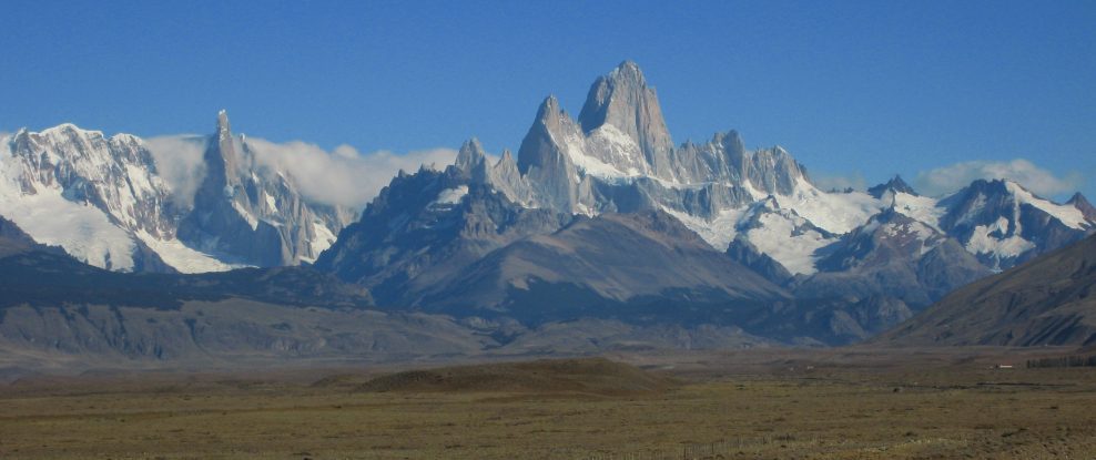 A cropped shot of the needle-y Cerro Torre, on the left, and mega peak Fitzroy in the center...