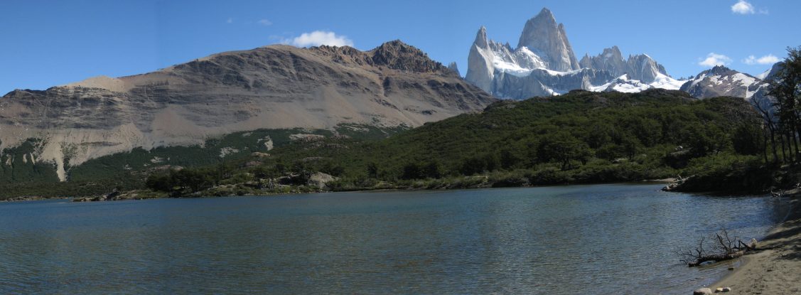 After this impressive scene, we continue on the trail until we reach the intersection of the path from Laguna Capri. We stash our packs in the bushes (bringing a small lunch bag), and hike down to the lake, to witness the views from there. Again, Fitzroy is a behemoth and mesmorizing. We eat ham and cheese sandwiches along the lake. BTW, common ham in Argentina is like gourmet prosciuto in the US.