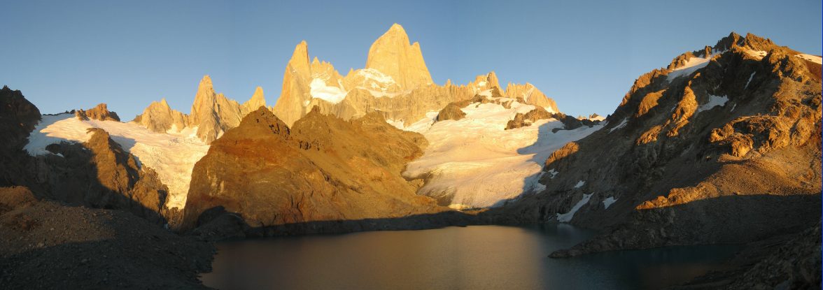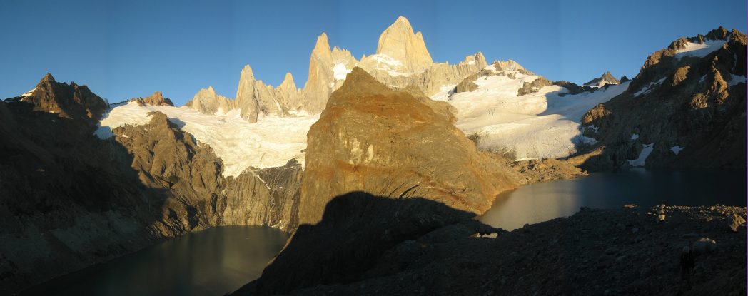 Finally ~8:20am, the tip of Fitzroy turns light pink. The color darkens a bit and starts sliding down the peak. The total lack of clouds prevents a truly magnificent deep red glow of the early light reflecting off the clouds, but still, the red spreading down the mountains is quite pretty, and we take plenty of pics.