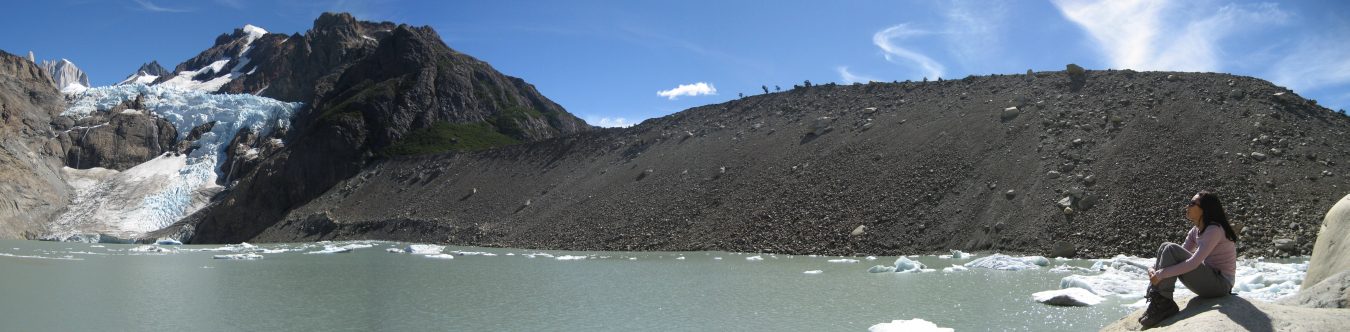 Eventually, and fairly swiftly, we reach a large pool in front of the glacier with small pieces of ice floating in it. The view is simply phenomenal, and entirely unexpected for this hardly ever mentioned about hike. Wendy declares it her favorite view of Patagonia so far, and it trumps Laguna Tres as the best view of the day for me too. More people should come here. We only see 2 people on the other side of the stream.