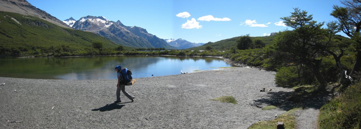 Back at camp we pack up the tent, ready our bags, and hit the trail at 1:10pm. No lunch yet, due to our large, late, breakfast. I carry all the remaining food and the whole tent (usually Wendy carries the poles and ground cloth). Our packs are pretty light with just one night left (Wendy's especially!). We hike back on the trail out of camp for about 20 minutes, and then take the fork south towards Cerro Torre. There are brilliant skies and views as the trail gently climbs into a forest on the side of a hill and overlooks two lakes as we pass them by.