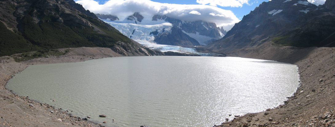 After crossing a small ridge, we got our first views of Cerro Torre. The tip was covered in cloud arising from the nearby glacier...