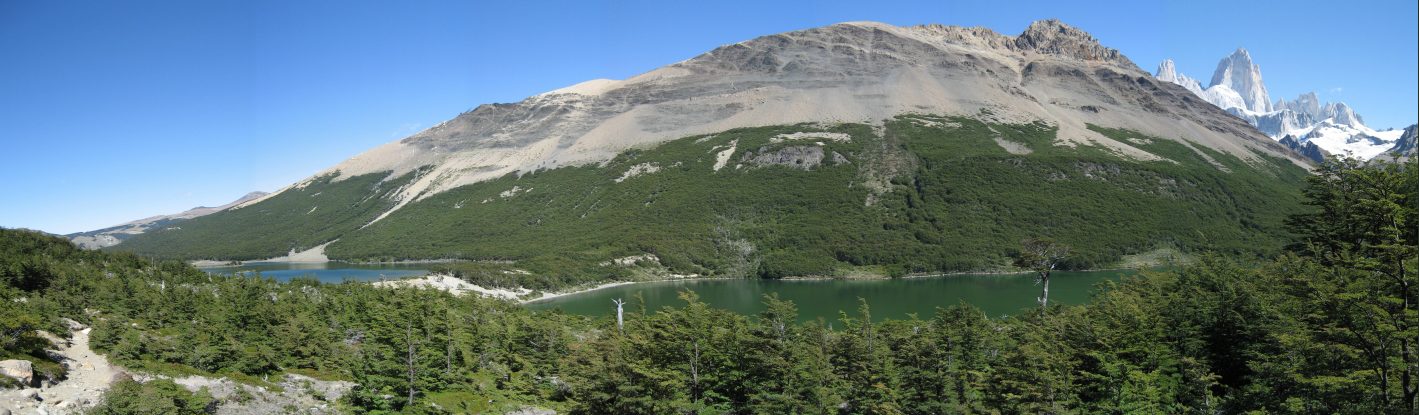 Fitzroy appears above the 1st lake, looking back. We eat lunch at the second lake at one of the few shady spots in the area...