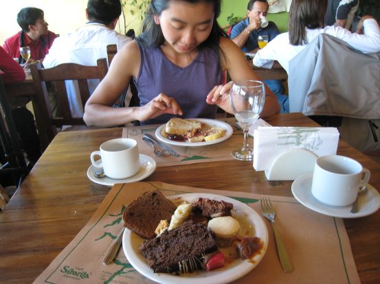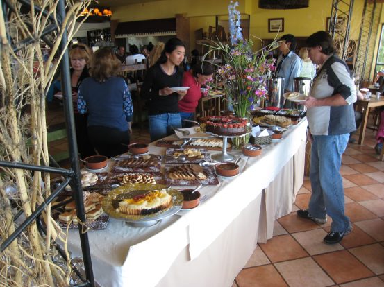 Our small group is led into the dining area where there are decked out tables of gourmet jams, breads, pasteries, pies, and goodies. It's all open for the eating, and I excitedly load my plate, while Wendy is wary about eating much and spoiling her appetite for the BBQ dinner later. There's tons of great stuff. Fig jam, raspberry jam, strawberry jam, plum jam, apricot jam, marmelades with nuts... There's a "strawberry pizza"-ish cakey thing too. Plenty of breads, oh, and dulce de leche too. Mmmm.... We both eat a bunch. This is definitely an opportunity to try fancy jams and pastries that I certainly haven't had and won't have again for a long time. I relish it, and still try to hold off JUST a bit of room for later too (I'm still confident in my abilities to stuff myself later). A look around makes it obvious that we are by far the youngest two people here that weren't brought by their parents.