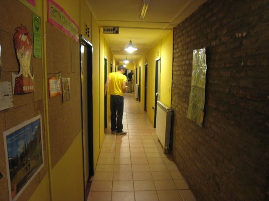 A look down the hall of our hostel in El Calafate. We stayed in 3 different rooms in this hall, and charged batteries on the lone sockets here...