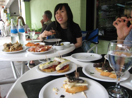 Our lunch cafe is nearby, and we arrive there at noon, but find out they aren't open until 12:30. We revisit the market for awhile, and come back for lunch. This is another place recommended in Christine's book. We sit outside at a table on the sidewalk (inside is reservation only!), and peruse the menu. This is our last big meal here, and they are giddy as always as they pour over all the excellent options on the menu. I formulate an analogy in my mind: Eating at fine restaurants for them is like a sports nut going to the big game. Nothing beats the pre-game (or pre-order) anticipation at what might be one of the greatest sporting outcomes, or meals consumed. Once the game/food finishes, it could be a loss or dissapointment, or triumph, but the excitement at the beginning is always something to savor and appreciate. I lean back and let them handle the menu decisions. Wendy and Christine order us six tapas dishes! And one main course (salmon) for us to share. The waitress says it's a lot. But given it's the last big meal, why not?