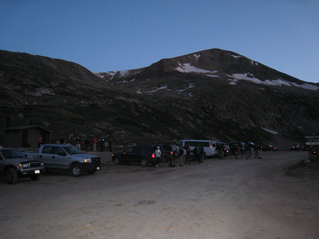 After missing the turn in Alma (the Kite Lake sign is really small, and right below the street sign), I made the 6 mile drive up the decent dirt road, glad to have Wendy's Honda CRV, as my VW GTI would have been much slower over the bumpy road. I passed several people camping, and stopped just prior to the parking fee area at Kite Lake. I hit the trail at ~5:45am, no headlamp needed, since sunrise was at 6am. In .1 miles, I arrived at the extremely crowded Kite Lake parking lot, where the line to the latrine was 7 people long, and a swarm of hikers were gathered amongst the cars. It was probably an organized group outing for 6am. I decided to pass on a visit to the latrine, and get started ahead of the crowd.