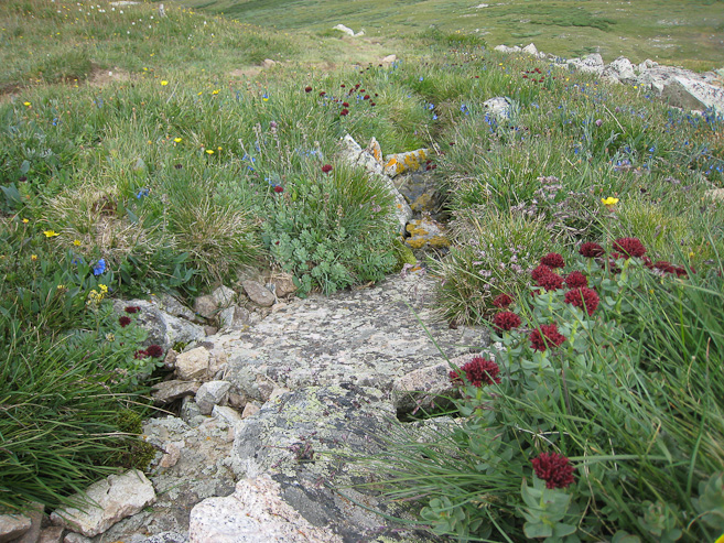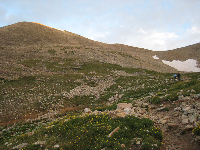 Looking back up the ridge leading to Bross, I could see more hikers descending. Once I returned to vegetation, there were wildflowers in the grass...