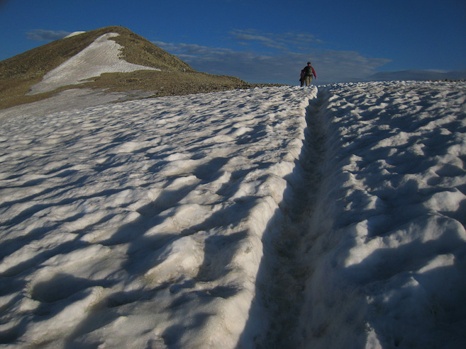 At the top of the false summit, there was a small snow patch to cross. The weather today was splendid. A single layer long sleeve suited me, and some people were in shorts. No wind...