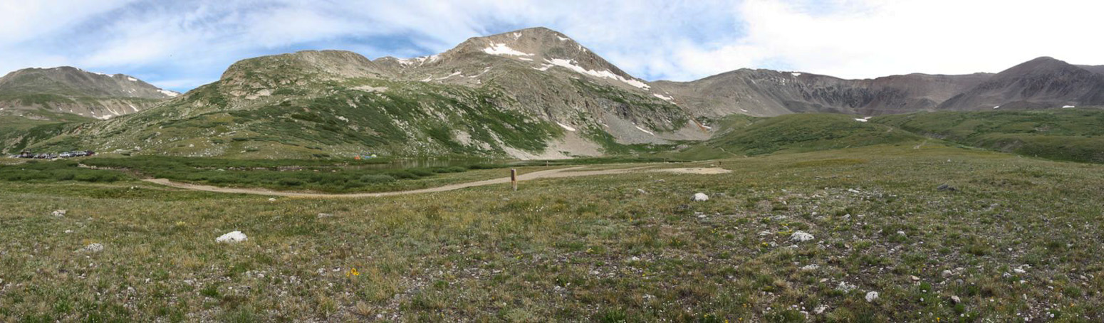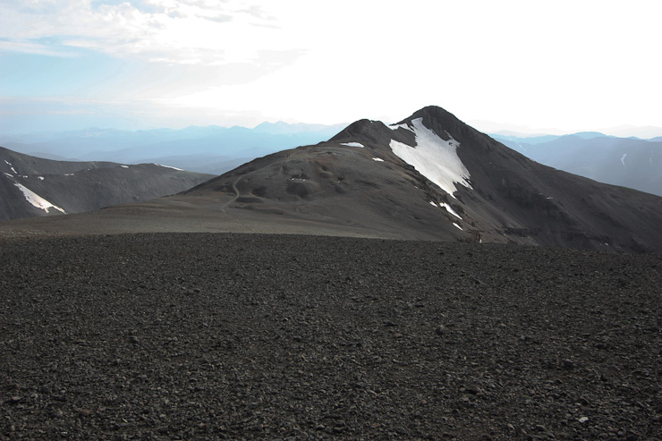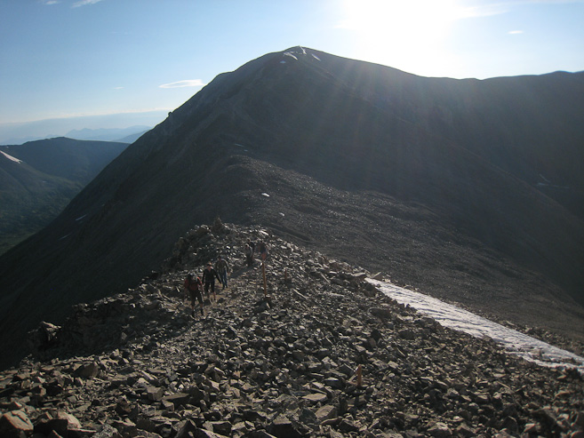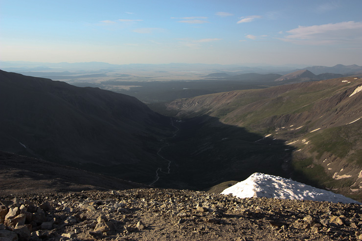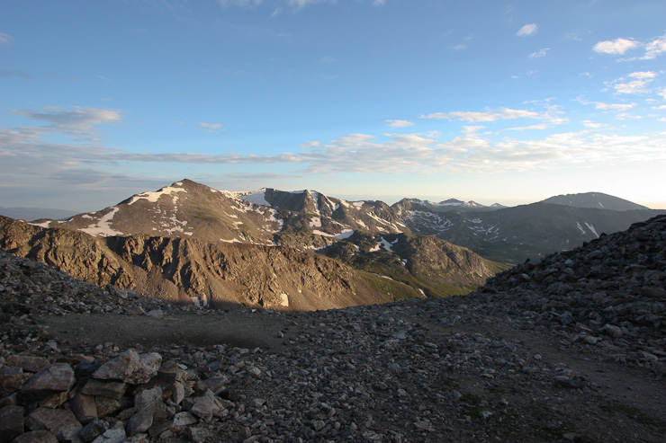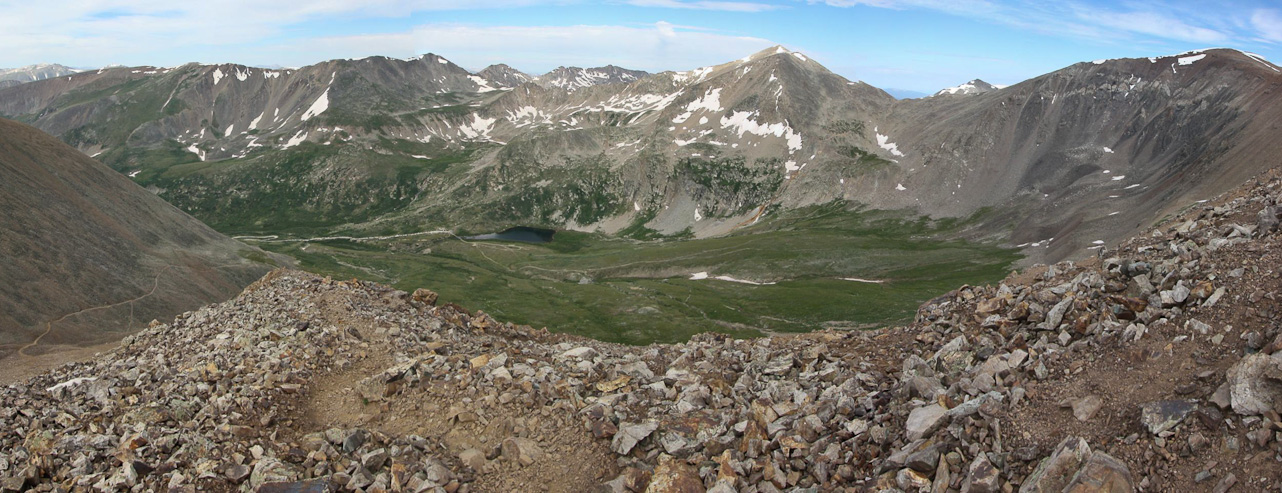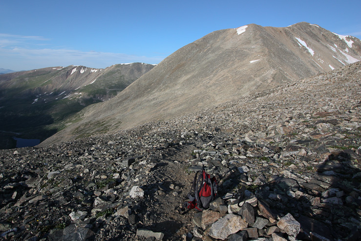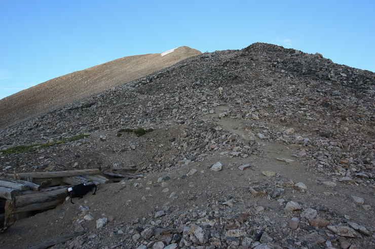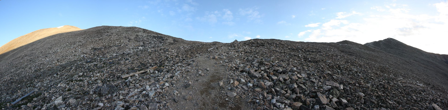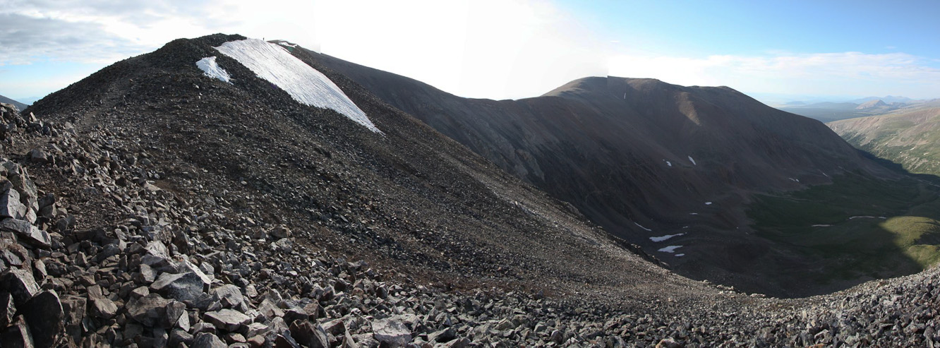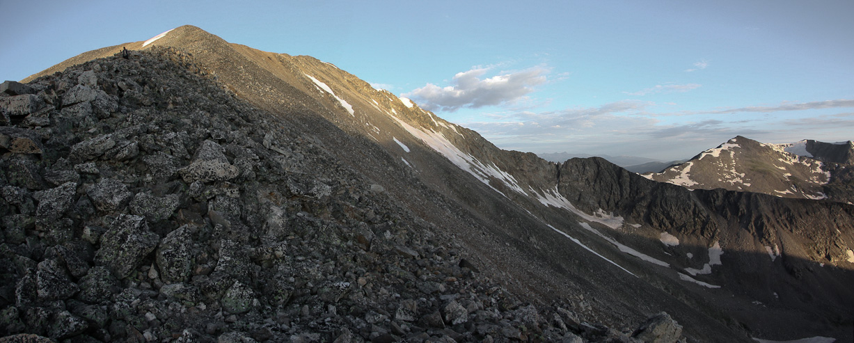 A few people were resting at the saddle when I arrived at 6:40am. A look up towards Democrat, and a look north over the saddle, with Quandary off on the right...