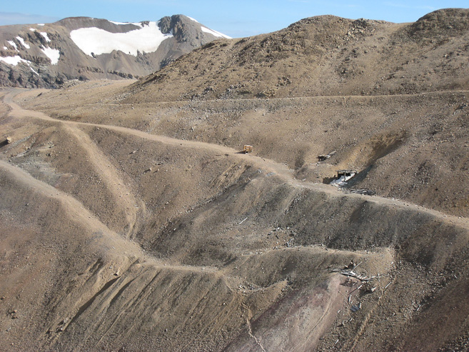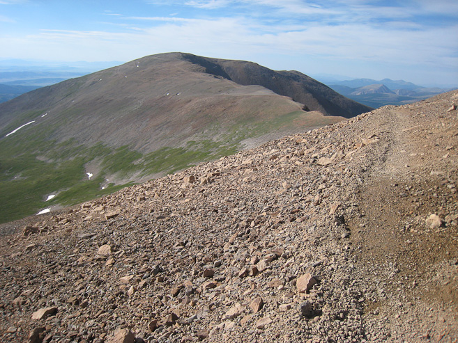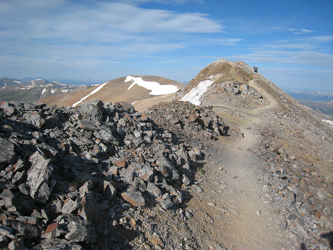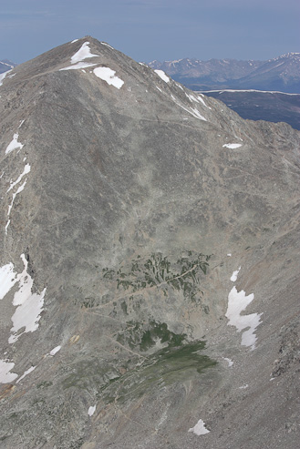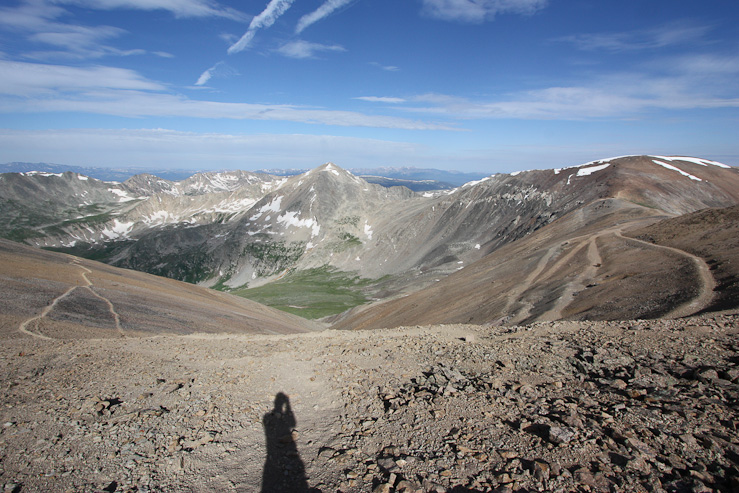 I met 5 others while on the expansive summit of Bross, and got this pic with Democrat on the background. After 10-15 minutes, I headed down the other side to return to Kite Lake. Here's a look at the trail leading down to the left, and the mining roads on the right...
