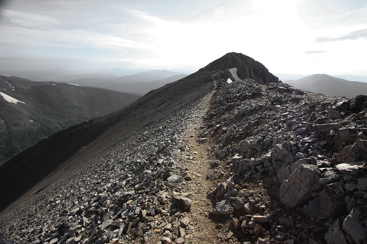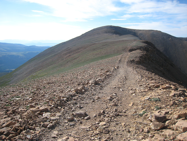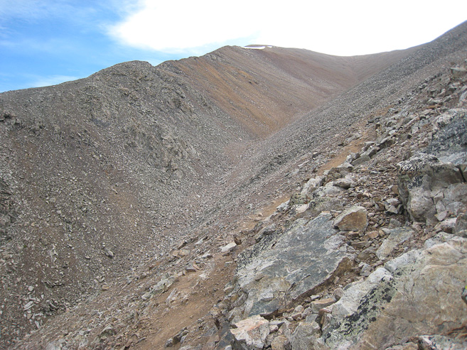 The true summit of Democrat began to appear, to the right of the false summit, as I climbed the well built rocky trail...