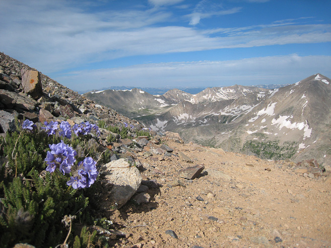 Some flowers from the trail, with Democrat on the right. All these 14ers are owned by mining companies, which is why Bross is still closed (the others recently re-opened). The owners voice concern about the mines possibly causing the ground to collapse, though the road and trails should be safe, and this area has long been open and used in the past...