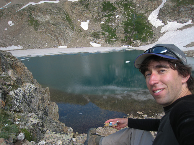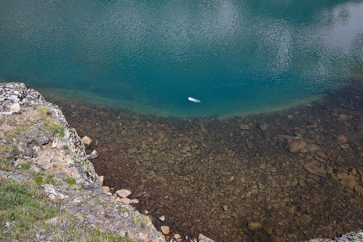 I was about to turn back from the spot in the above pic, but decided to wander closer to the edge of the lake to eat my last bar. The view was amazing, and the water was deep green. It looked like the depth of the lake fell off fast at the edge of the green color. I wondered how deep it was...