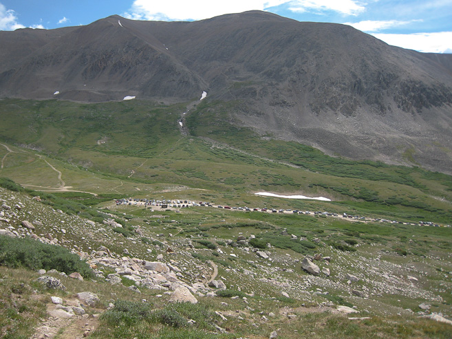 A look back at the trail cutting across the side of Cameron. Several more "specks" on the trail show that Bross is still a popular destination. The 2nd pic shows Democrat's peak, heavily swarmed with hikers from the summit, and running down the trail...