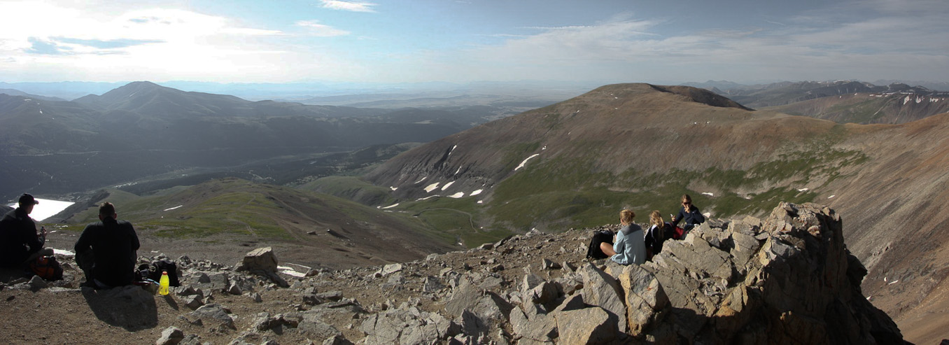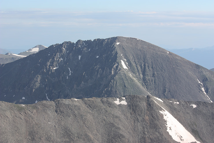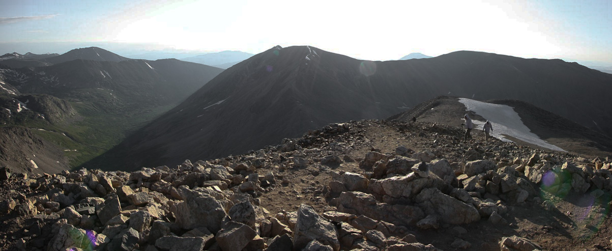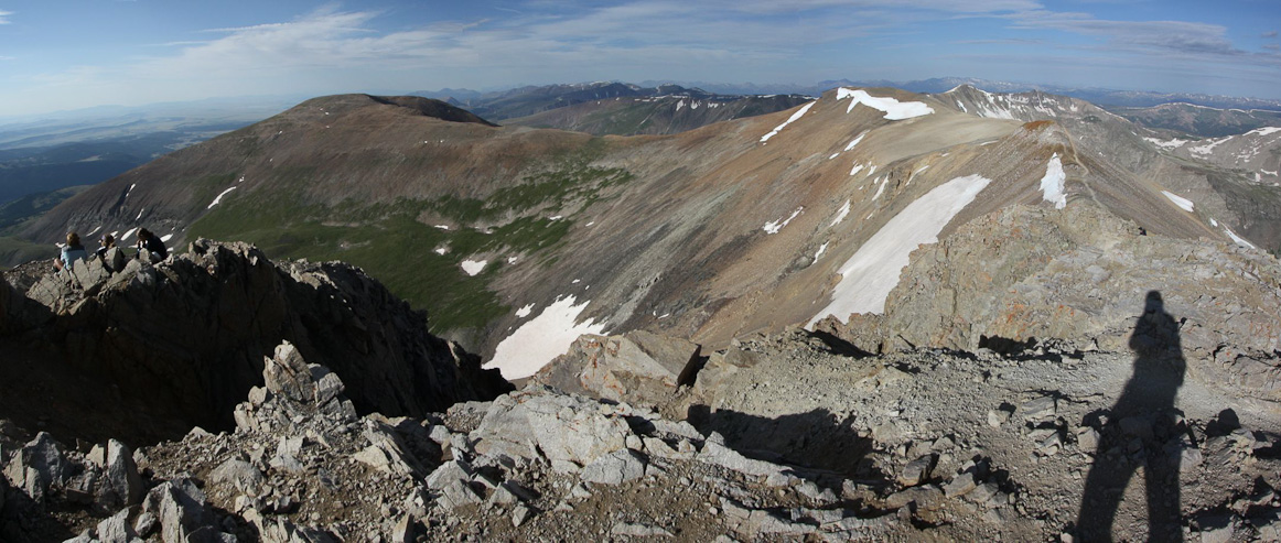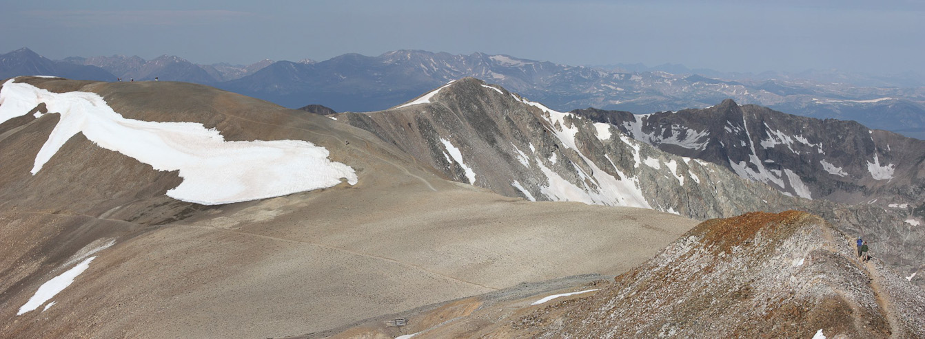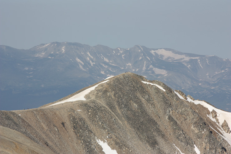 I hauled up my 1.75lb telephoto lens, so I better put it to use. A zoomed in pic of Quandary to the north. 2nd pic is of Democrat with hikers on the summit and ridge...