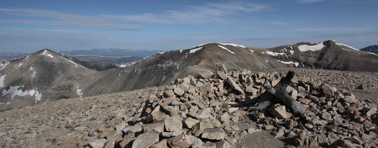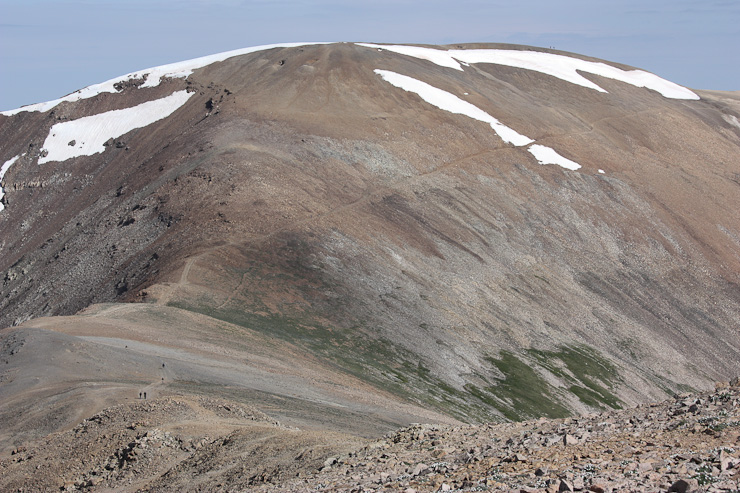 I reached the summit of Lincoln 15 minutes after Cameron, at 8:20am. A few others were around, who were planning to bag Bross as well. Mt Bross is the tan, flat-topped, mountain right of center...