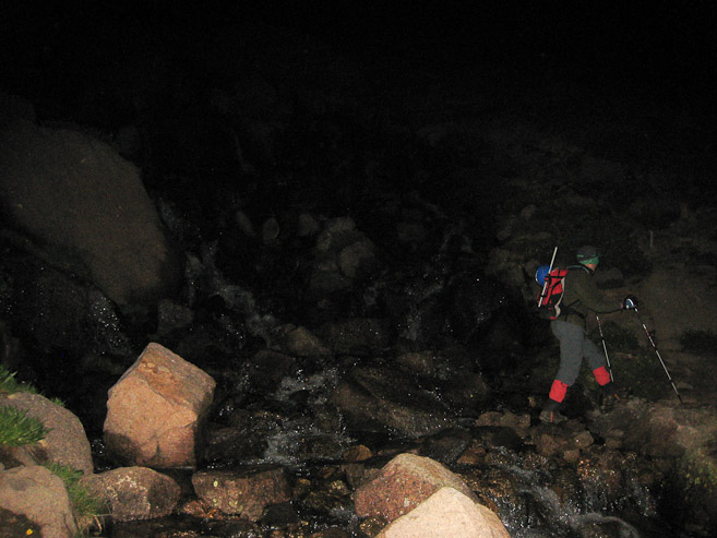 We set out in our headlamps at 3:55am. The trail crossed a stream as it climbed out of the lower basin...