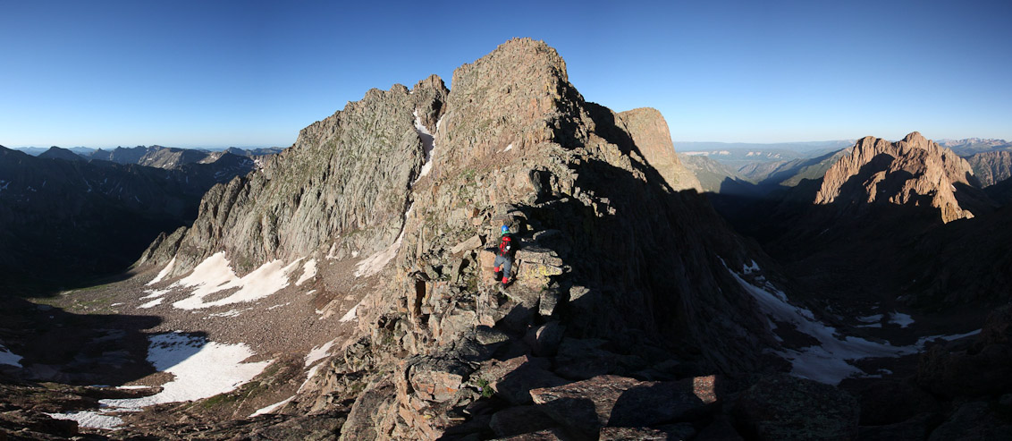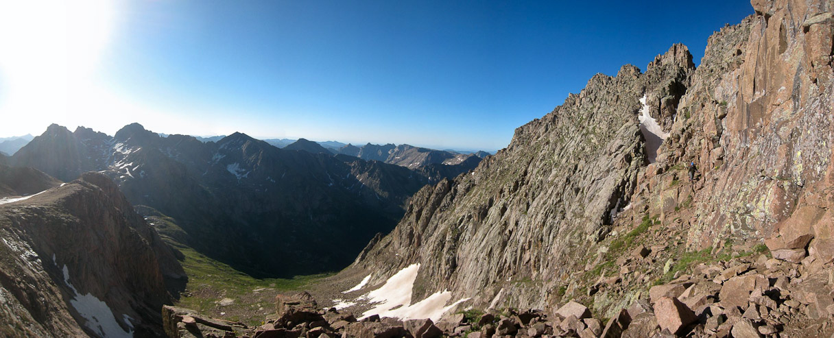 The views only got better as I ascended the ridge. A wide look back at the valley we camped in (left), Eolus and N. Eolus (center), Sunlight and Sunlight Spire (right)...