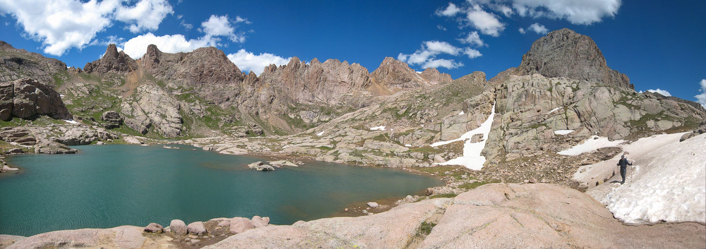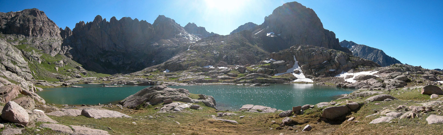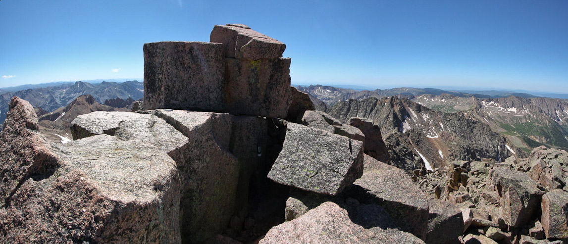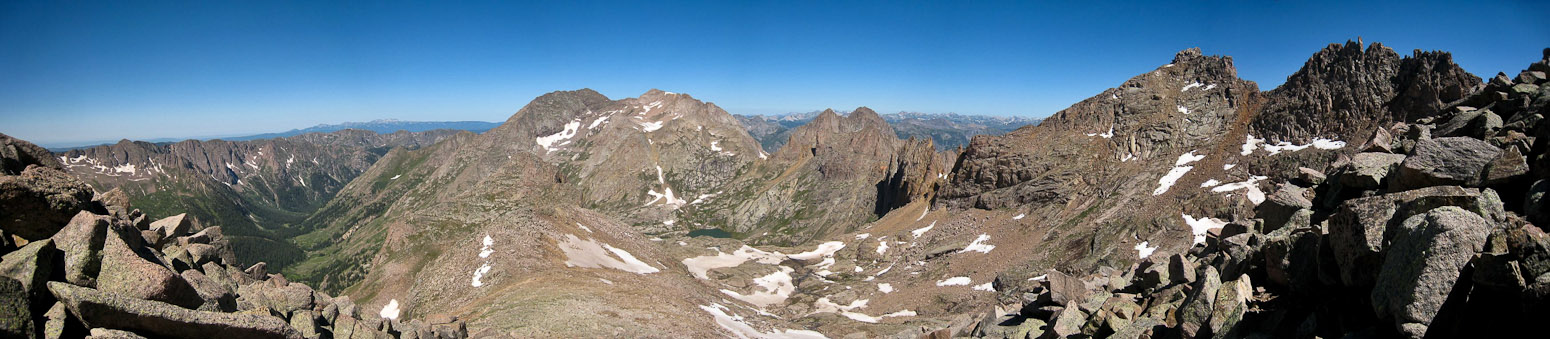 A pano from the summit, showing the pointy Sunlight Spire, Windom, the valley we camped in, and Eolus (left to right)...