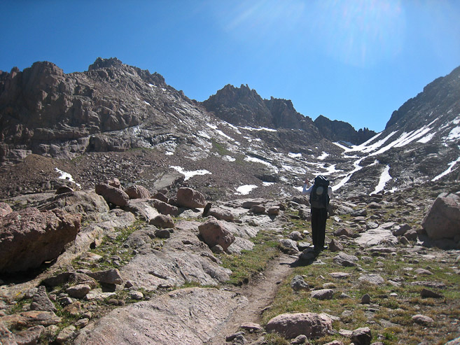 On the trail to the basin between Sunlight and Windom, following another hiker...