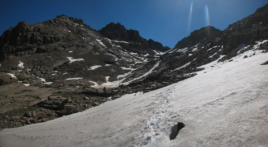 A look at my descent route, from the notch, down to the snow field, followed by a climb up towards Sunlight's orange scree saddle. Also, a look back up at the steep descent path...