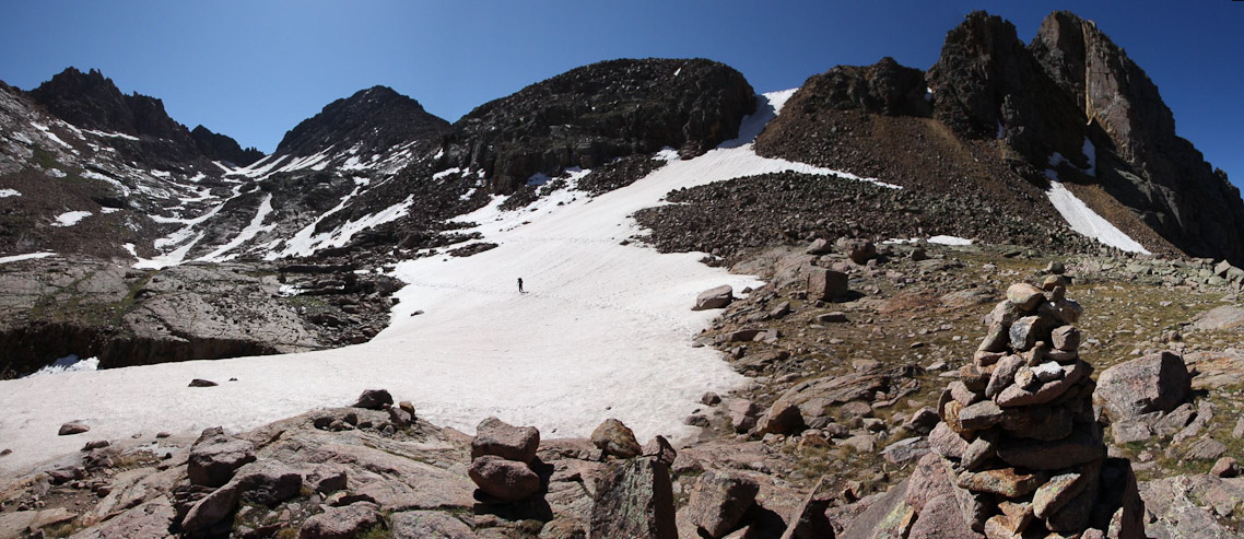 I stashed some non-food, non-pole, gear under this cairn, and headed across the snow, taking the set of footprints above the hiker in the picture, which lead to Windom...