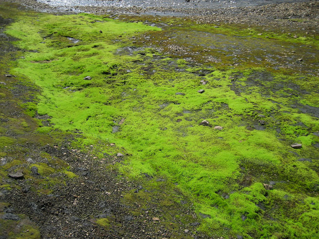 A look at the neon-green moss that likes to live on warm water apparently. After leaving the snow, to rejoin the trail, we came across a steam vent...