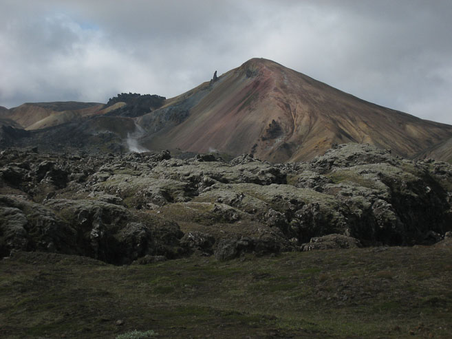 A look across the lava field at the mountain we climbed yesterday (with the black horn). My pack is also large and full...
