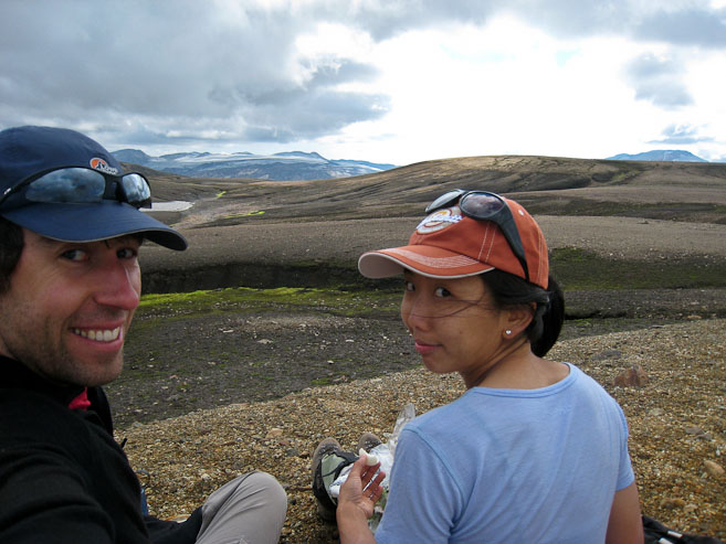 A pic during lunch. Wendy eats a hard boiled egg. We continued across the plateau, after spacing ourselves from a large tour group (surprised to see them so far from Landmannlaugar on a day hike)...