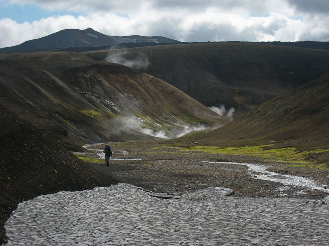 Eventually the barren plateau descends a bit into some vegetated ravines where several steam vents and some boiling pools of water belch out a sulfuric stench. The tour group stops here, but we continue on across a grey/black lava rocky plateau. This plateau has some consolidated snow banks, which are covered with black ash. Usually this trek has more snow, but I think the ash from the recent volcano helped speed up the melt this year.