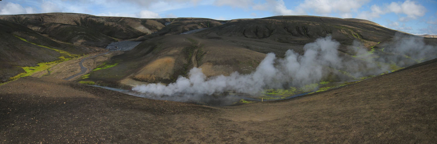 Upon reaching a rise on the plateau, we see a bunch of steam vents ahead. Exciting!