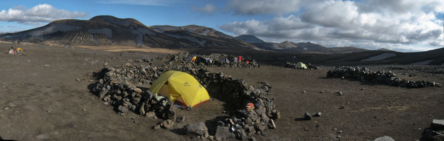 Beyond this snowfield, the trail leads to Hraftntinnusker hut, where we'll be camping tonight. The campground is a large barren flat area, with several rock rings signifying sheltered tent spots. We pay our 1000isk/person (same as it is every campground/hut on this trek), and set-up the tent in an available ring, first considering which rock ring would block the wind the best.