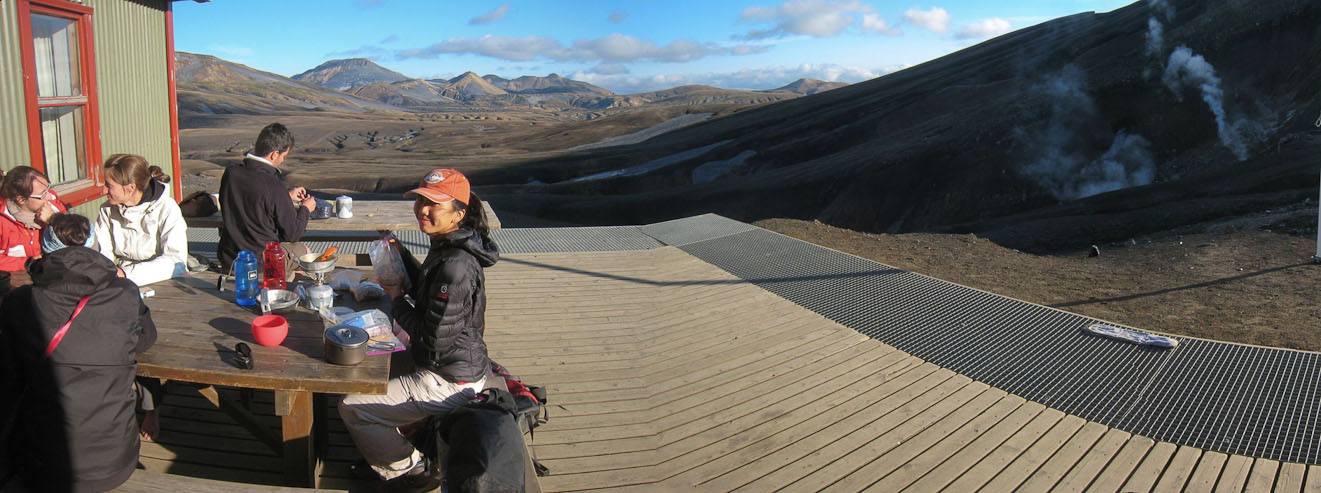 This was a great dinner spot. The hut blocked the wind, and the sun warmed us up. The scenery wasn't bad either, and the steam vents added to the atmosphere...