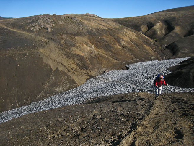 We leave camp ~10:10am, down the trail towards a series of ravines carved into the rocky/ashy landscape. Some of these ravines are deep and steep/slippery. We are careful to find the surest footing. The best footing occurs on "chocolate cake", a black sand/ash combo that gives like wet snow. The worst traction occurs on the compressed steep dirt with a fine layer of dirt/dust to get your feet slipping.