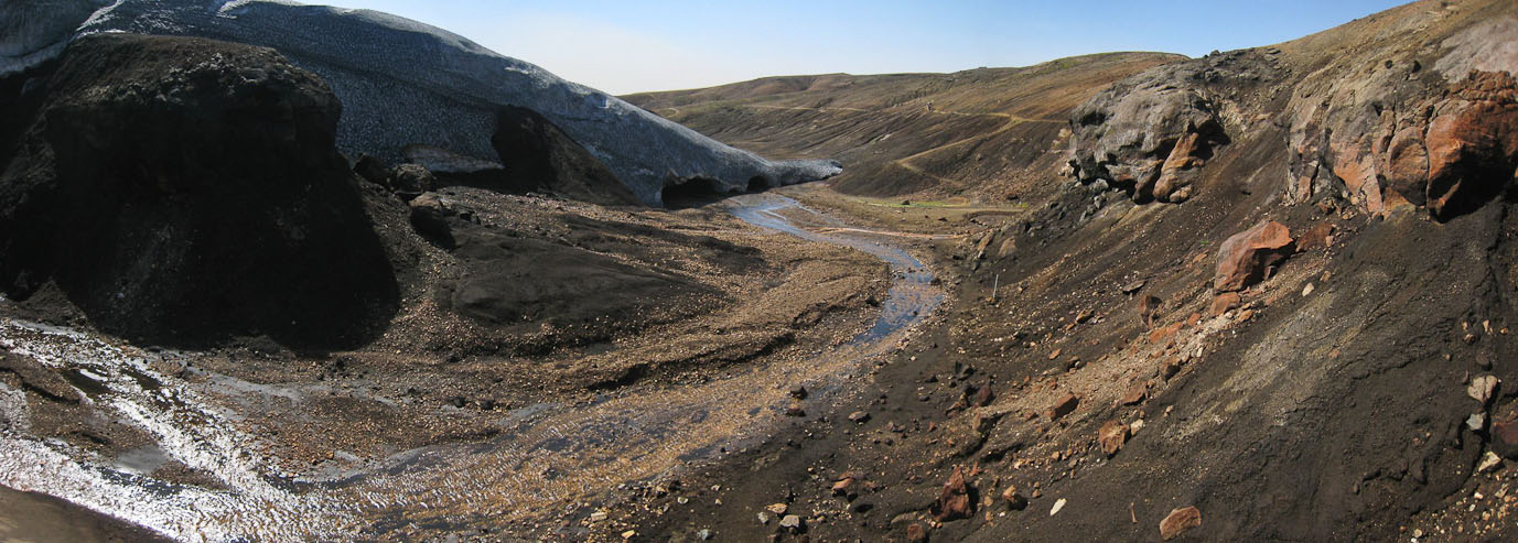 After a 10 minute descent, we're back to our packs, and get our handkerchief's ready for any ash/dust storm. We continue on the shelf and cross several more ravines, though these have some interesting steam vents and colorful vegetaion/mineral growth.