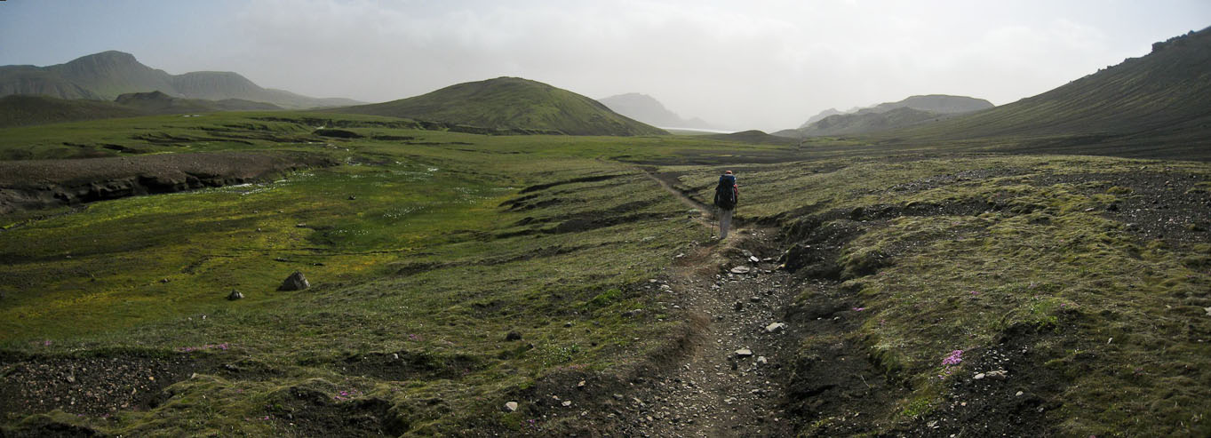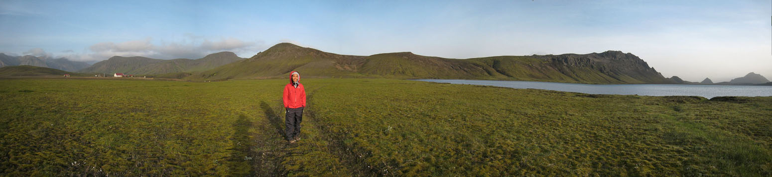 9:30pm, Alftavatn camp The noisy neighbors were annoying last night. I did some crosswords to try to sleep, but couldn't manage until ~11:40pm. Wendy wakes me with the 7:30am alarm, and we bring our breakfast supplies up to the hut to cook on a picnic table. It's the usual cereal blends, along with a dehydrated zuchini/sausage for Wendy. It's sunny and cloudless today! The weather has a large impact on my spirits whenever I'm hiking. We ask the warden about water availability, and he says there is none until the river crossing; Good thing we asked, cause we were thinking we could just fill up from streams all the way.