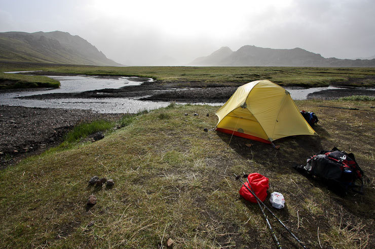 It was windy and cold when we reached the Alftavatn hut ~5pm. We found an awesome tent spot with a streamside view on the perimeter of camp, and carefully setup the tent in the wind, extra sure to prevent any gear from blowing into the stream nearby. Everyone seemed to have disappeared into their tents. No one was making any side hikes today.