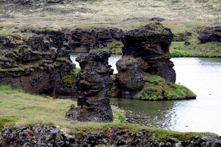 Man, this journal keeps me up at night, but gotta stick with it… I wake up at 8:30am this morning, 15 minutes before the alarm, and decide to check out the breakfast buffet. It's just bread, sliced cheese, ham, salami, and cereal, so decide to pass (not hungry anyway). I lay around until the alarm kicks in, and decide to research places to stay for the remainder of the trip. The hut attendants let me borrow their phone, and I call tons of places, but most everything is booked. I'm able to find reservationss for Thurs and Fri night fairly quickly, but can't' find any for tonight (Wed). I'm on the phone for ~1hr calling places while Wendy packs the car. We decide we'll have to camp tonight, though the thought of setting up a tent and camping is somewhat disapointing, as we've been getting used to sleeping bag accomodations in guesthouses. Finally it's time to head for Myvatn at 10:10am for some sight seeing, despite being dissapointed about not finding accomodations tonight. The 1st stop is along the south edge of the lake where there are "pseudocraters". Boring. Kind of looks like a golf course. The bugs are terrible here, and we abort our hike shortly.